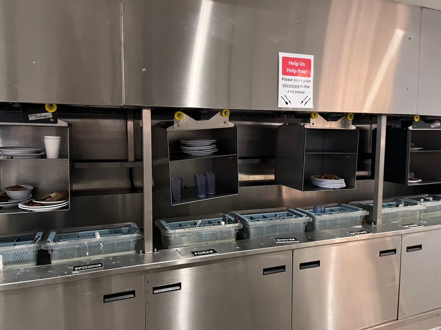 Overall, the system was a big success at Morrison. It reduces the number of items placed on the dish carousel and helps staff wash utensils quicker, which helps the small number of staff they have. Most importantly, since its implementation, this system has helped Morrison switch to reusable dishware, preventing tens of thousands of disposable items from entering the landfills each day! Additionally, according to dishwashing staff, the system has made working conditions safer by significantly reducing the amount of utensils falling from the dish return onto the staff in the dish room below.