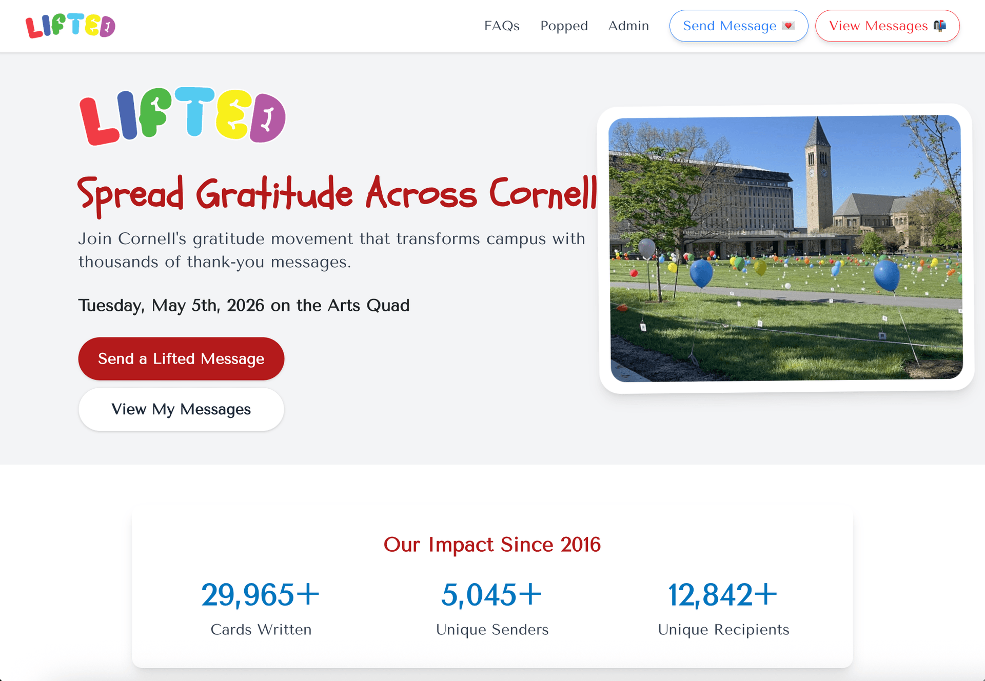 Lifted is quite a difficult project to pull off, both logistically and technically. On the user-facing side, it requires Cornellians to send messages and become notified of messages sent to them. On the backend, it requires verifying that senders inputted the correct recipient NetID, converting messages into PDFs, printing messages, sending thousands of emails, send eLifted messages, and so much more. Previously, each of these processes took countless hours of manual work.